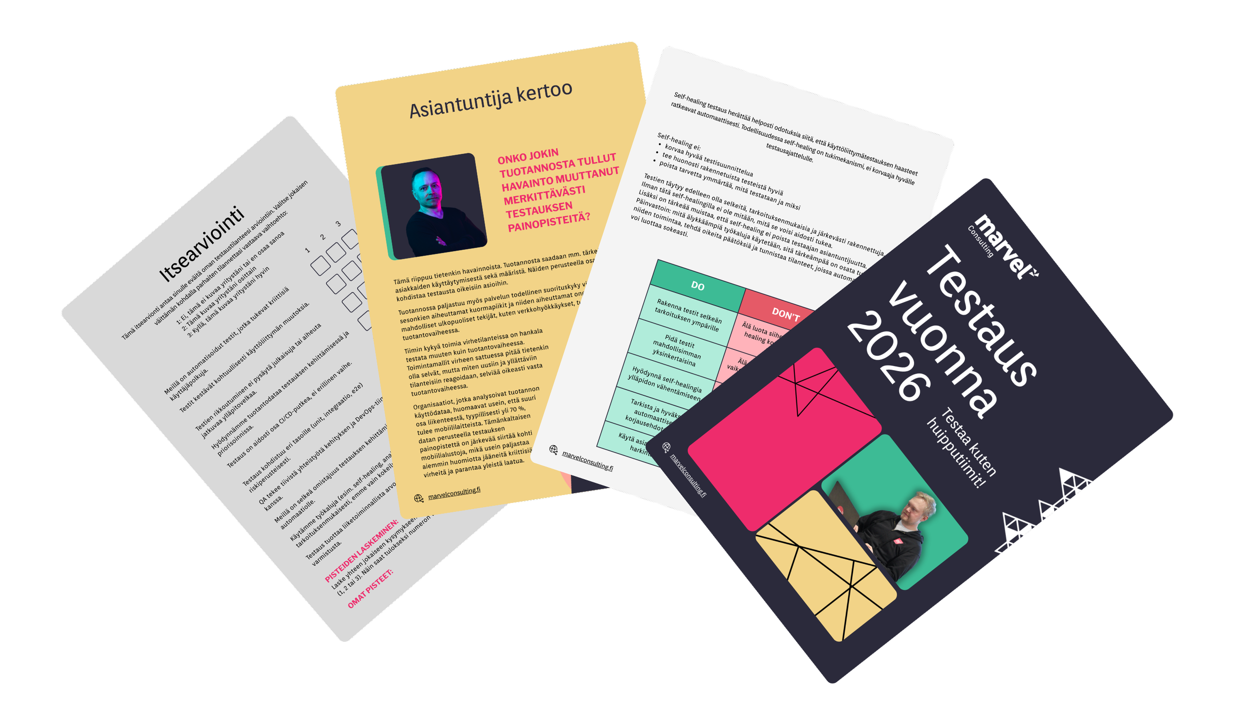 Tällaisia teemoja käsittelemme tuoreessa Testaa kuin huipputiimit -oppaassamme! Oppaasta löydät myös Marvel Consultingin oman testausautomaation asiantuntijan Valtterin vinkkejä ja näkemyksiä aiheisiin liittyen, jotta saat parhaan mahdollisen hyödyn tiiviissä pakkauksessa. Vastaamme mielellämme myös lisäkysymyksiin!